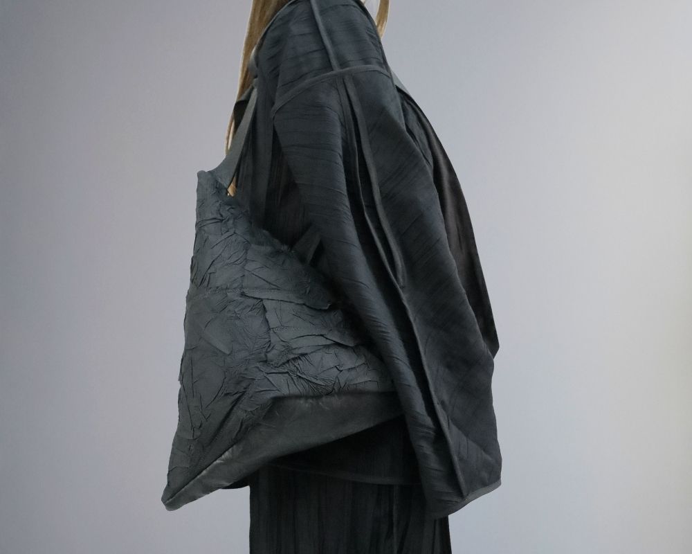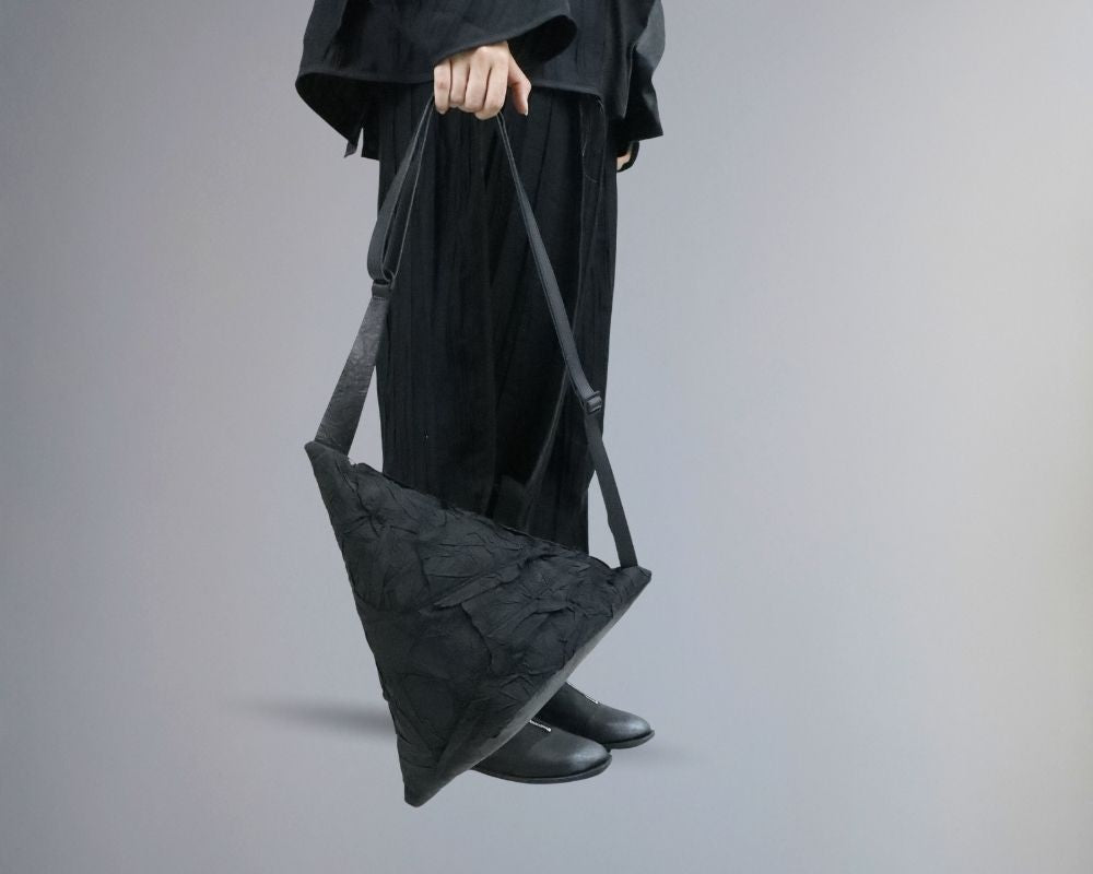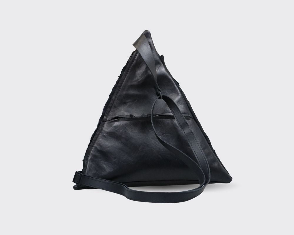Dreiecksform ..... Zipper auf der Innenseite .... Glattleder innen ..... Geknittertes Leder vorne mit Zipper oben