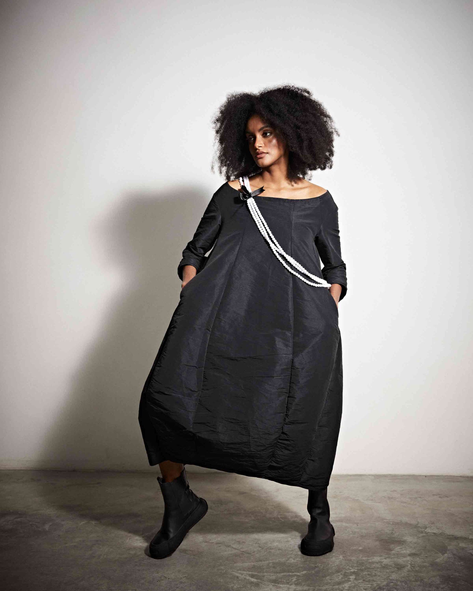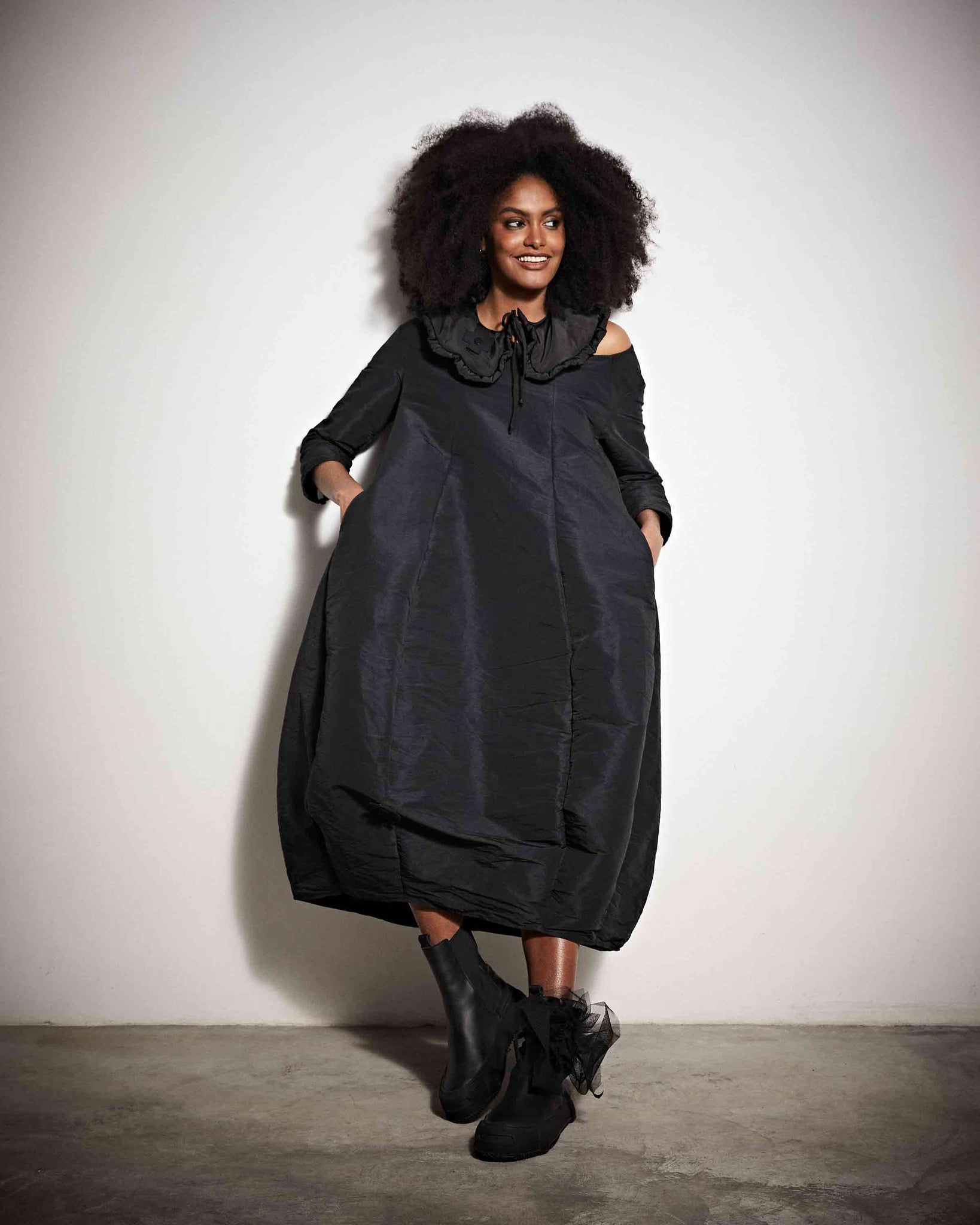 Taftmaterial …. Tulpiger Schnitt … Carmenkragen zum Binden … seitliche Eingriffstaschen