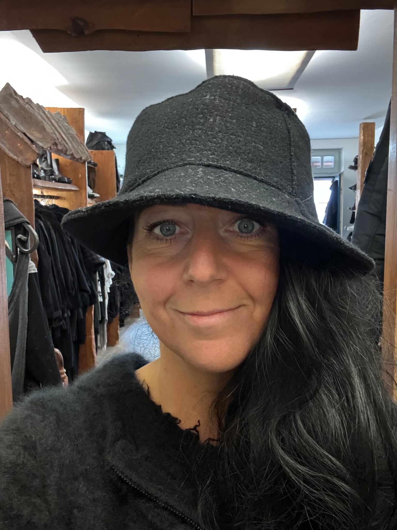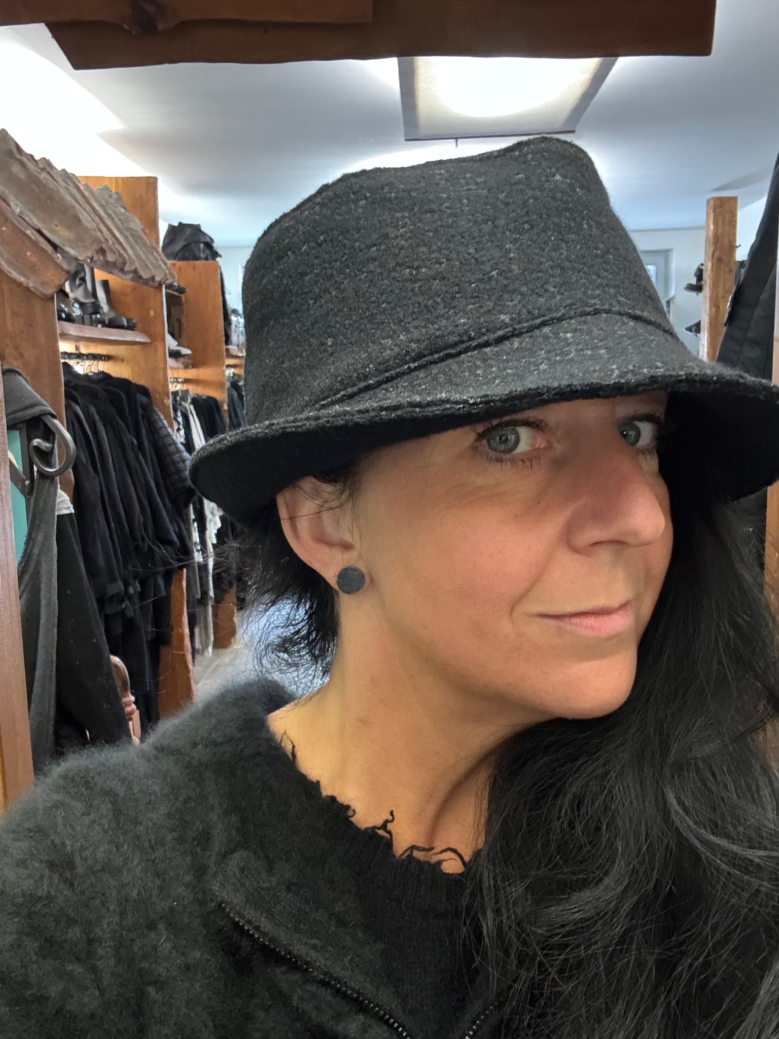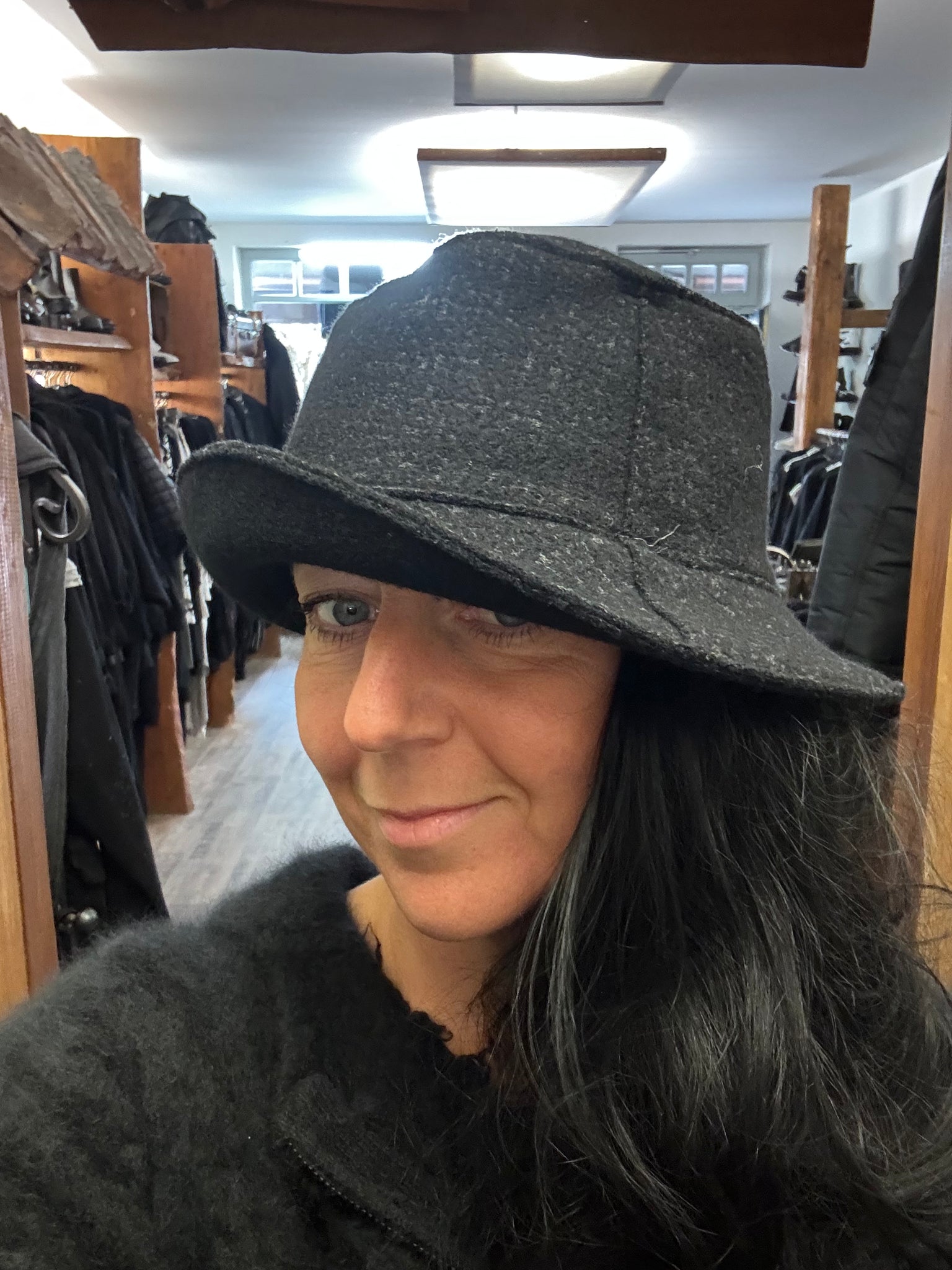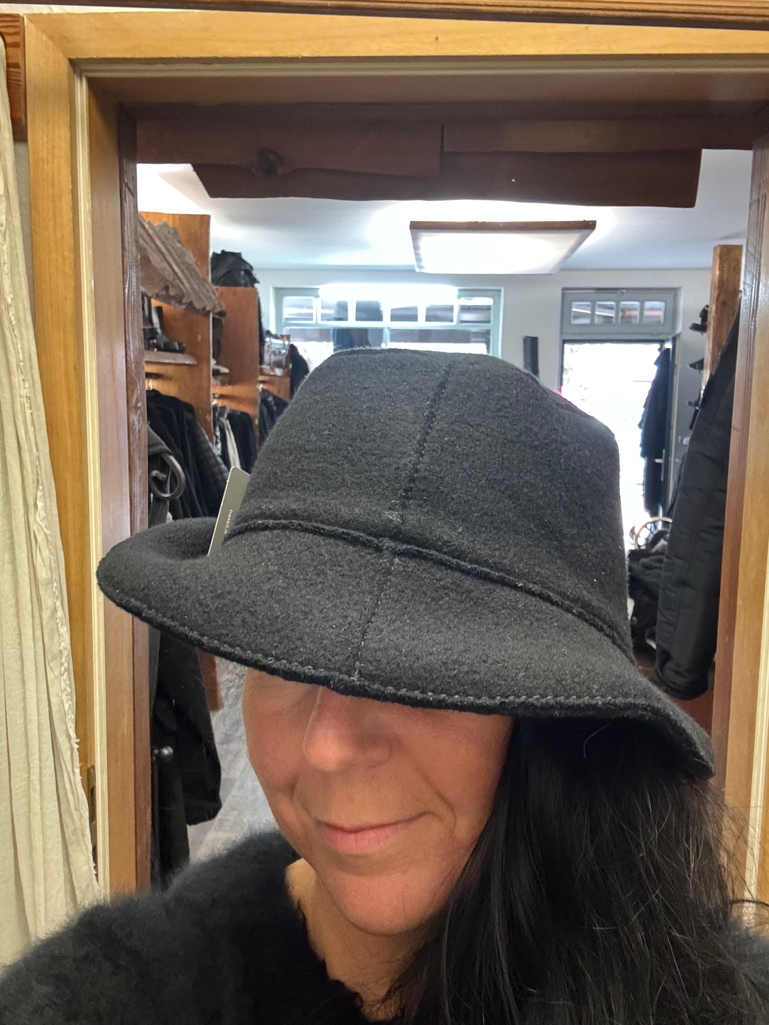 Wendehut …. Gewalkte Merinowolle doppelt ……eine Seite Schwarz die andere Seite schwarz meliert ( Fotos 1-3)